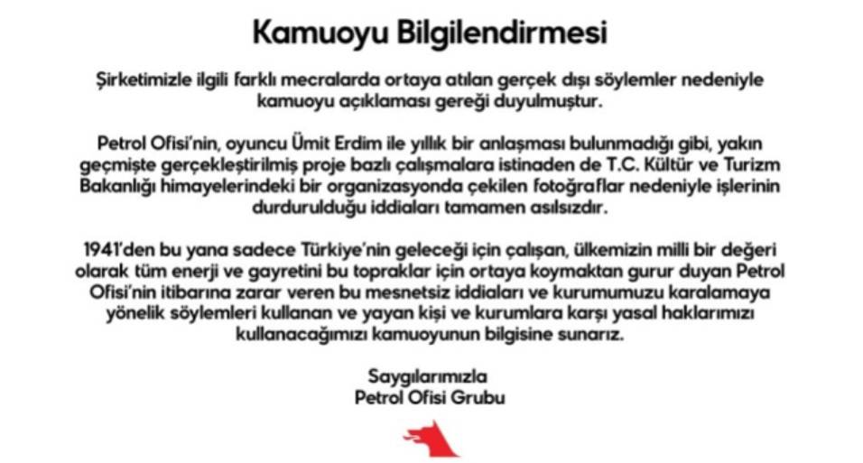 Oyuncu Ümit Erdim'in açıklaması sonrası Petrol Ofisi, olayla ilgili "Kamuoyu Bilgilendirmesi" yayımladı.